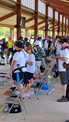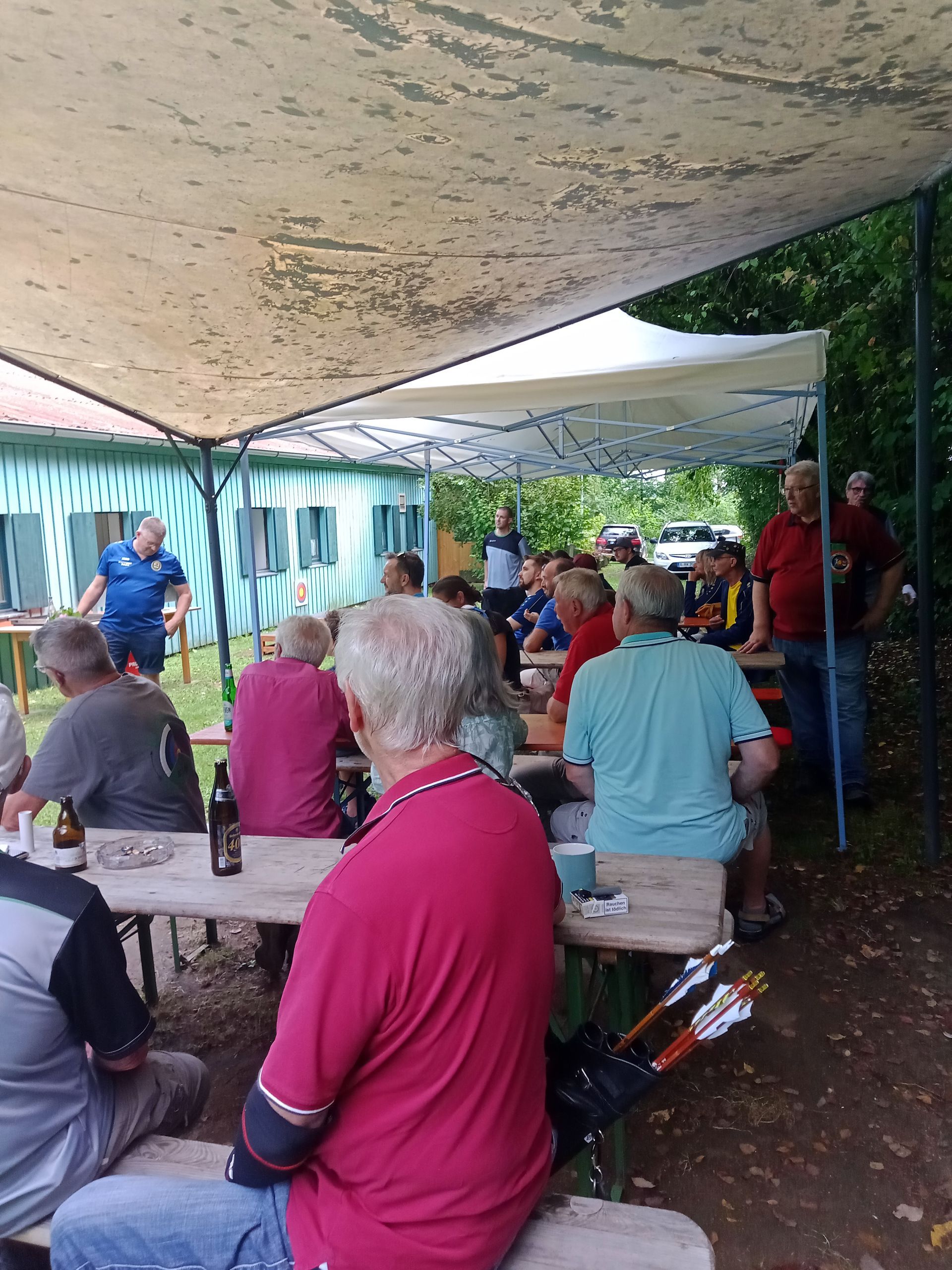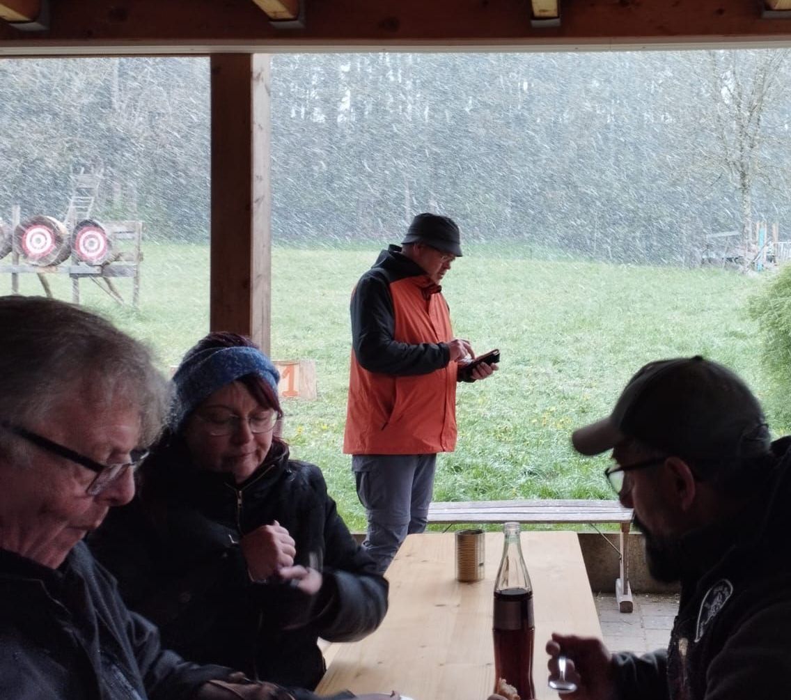 Leider änderte sich das Wetter in der Nacht drastisch: Bereits ab 2:00 Uhr morgens suchten Starkregen und heftige Windböen unseren Austragungsort heim. Zieht im Normalfall schlechtes Wetter immer links und rechts an uns vorbei, erwischte es uns diesmal so richtig. Laut ersten Wetterberichten sollte dieses Unwetter gegen 8:00 Uhr morgens vorbei sein. Leider entschied sich der Wettergott jedoch anders: Starkregen wechselte sich mit strömendem Regen ab, trocken war es nur minutenweise. So ging es bereits mit etwas Verzögerung gegen 9:30 Uhr im strömenden Regen an die Probepfeile. Zum Ende der Einschießzeit waren alle bis auf die Haut durchnässt, obwohl sich alle Schützen sofort nach dem Schießen wieder unter die zahlreichen Pavillons und Schirme retteten.