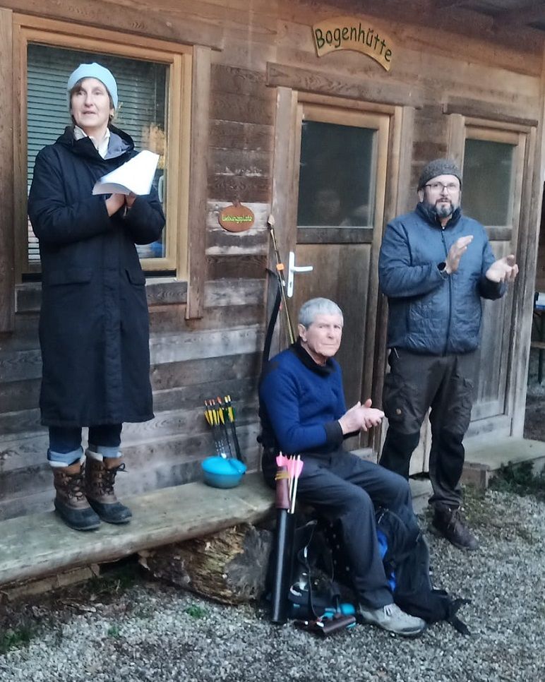 Die Auswertung: Alle versammeln sich in der Gaststätte. Rolf schaut sich die drei Zielscheiben konzentriert an. Vor allem die des Weihnachtsmanns mit dem überdimensionalen Ohr. „Also…“ sagt er langsam. „Die Jagd- und Langbogenabteilung hat ein kreatives Gesamtbild geschaffen. Die olympisch Recurver haben technische Perfektion gezeigt. Und die Compoundabteilung… nun ja… die hat dem Weihnachtsmann eine Schönheitsoperation verpasst.“