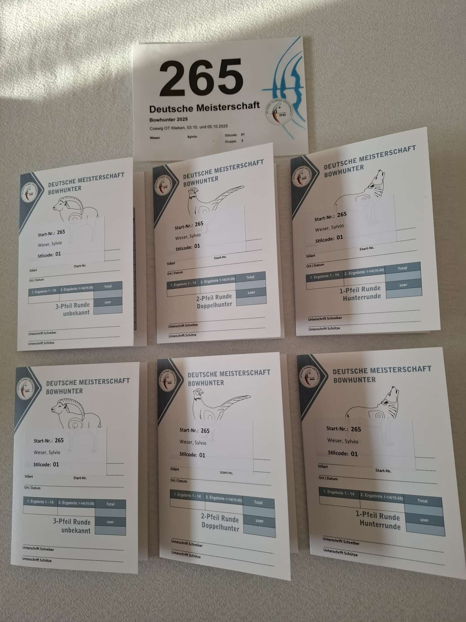 Der letzte und alles entscheidende Tag (Sonntag) begann um 08.50 Uhr an den Stationen, heute die Doppelhunter-Runde (2 Pfeile /Tier). Wetter heute bewölkt und ziemlich viel Wind, der die Pfeile manchmal irgendwie komisch fliegen ließ! Der Anfang stockte, bei den ersten 6 Pfeilen 4 daneben. Doch dann wurde es besser und am Ende des Tages konnte ich mir den Titel "Deutscher Meister" sichern!